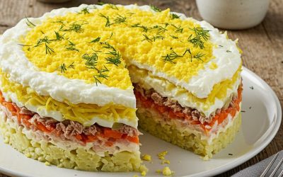 Warstwowa sałatka Mimoza z konserwowymi rybami i jajkami