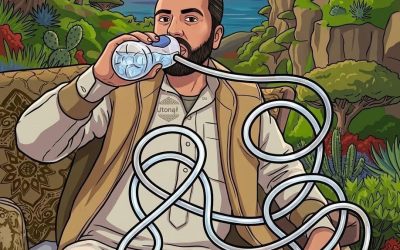 Moim zdaniem, mężczyzna pije wodę. Jeśli przyjrzeć się uważnie labiryntowi rur, widać, że rura połączona z butelką, którą trzyma, prowadzi…