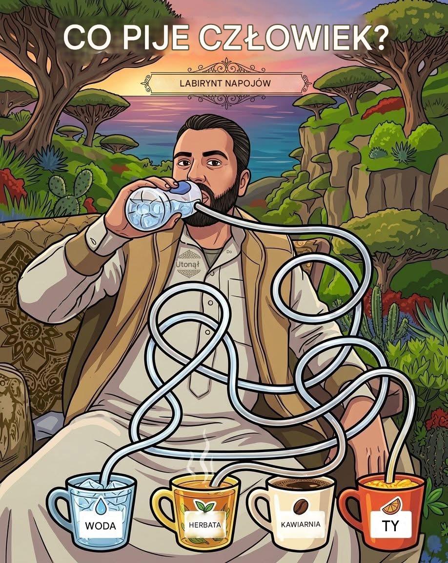 Moim zdaniem, mężczyzna pije wodę. Jeśli przyjrzeć się uważnie labiryntowi rur, widać, że rura połączona z butelką, którą trzyma, prowadzi ostatecznie do kubka z napisem „WODA”. Chociaż rury wydają się bardzo skomplikowane i krzyżują się kilkakrotnie, właściwa ścieżka zaczyna się przy butelce i biegnie zakrętami aż do kubka z wodą.