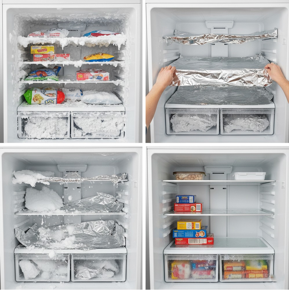 W rzeczywistości należy przykryć wszystkie boki zamrażarki. Następnie można włożyć zamrożone jedzenie z powrotem i poczekać, aż folia stwardnieje. W praktyce lód roztopi się i osadzi na folii, a po jej usunięciu zamrażarka będzie czysta i wolna od wszelkich problemów.