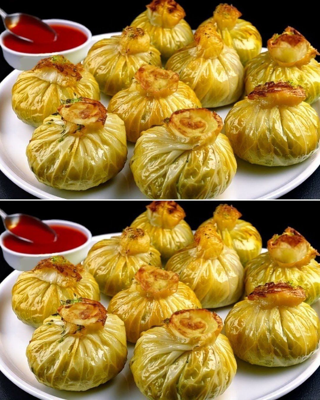 Te zachwycające momosy z kapusty zamieniają zwykłe liście kapusty w eleganckie małe paczuszki wypełnione pikantną mieszanką ryżu, mięsa i grzybów. Połączone jak małe paczuszki prezentowe i podane z pikantnym i aromatycznym sosem pomidorowym, te gołąbki są zarówno efektowne wizualnie, jak i niesamowicie pyszne.