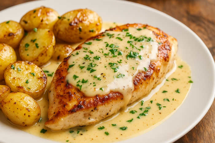 Składniki do przygotowania piersi z kurczaka z sosem serowym i pieczonymi ziemniakami