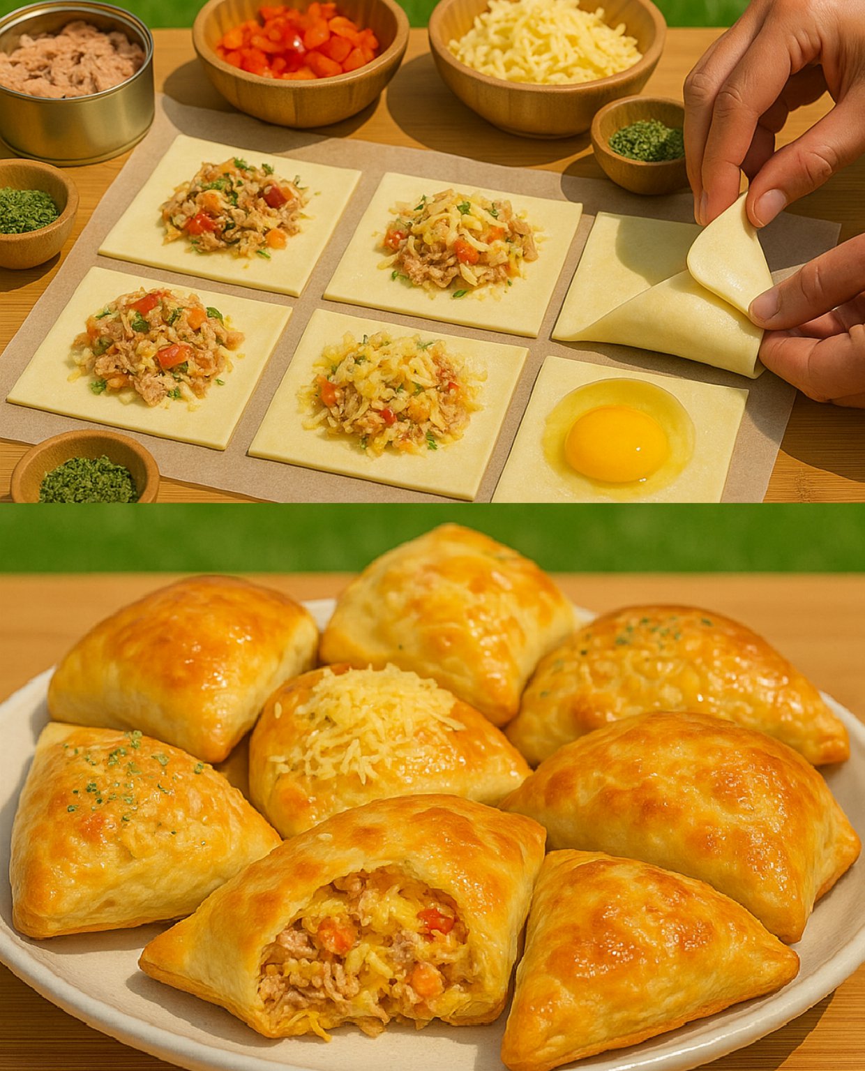 - Przygotowanie: Wyłóż masę tuńczykową na ciasto francuskie, posyp serem i papryką.