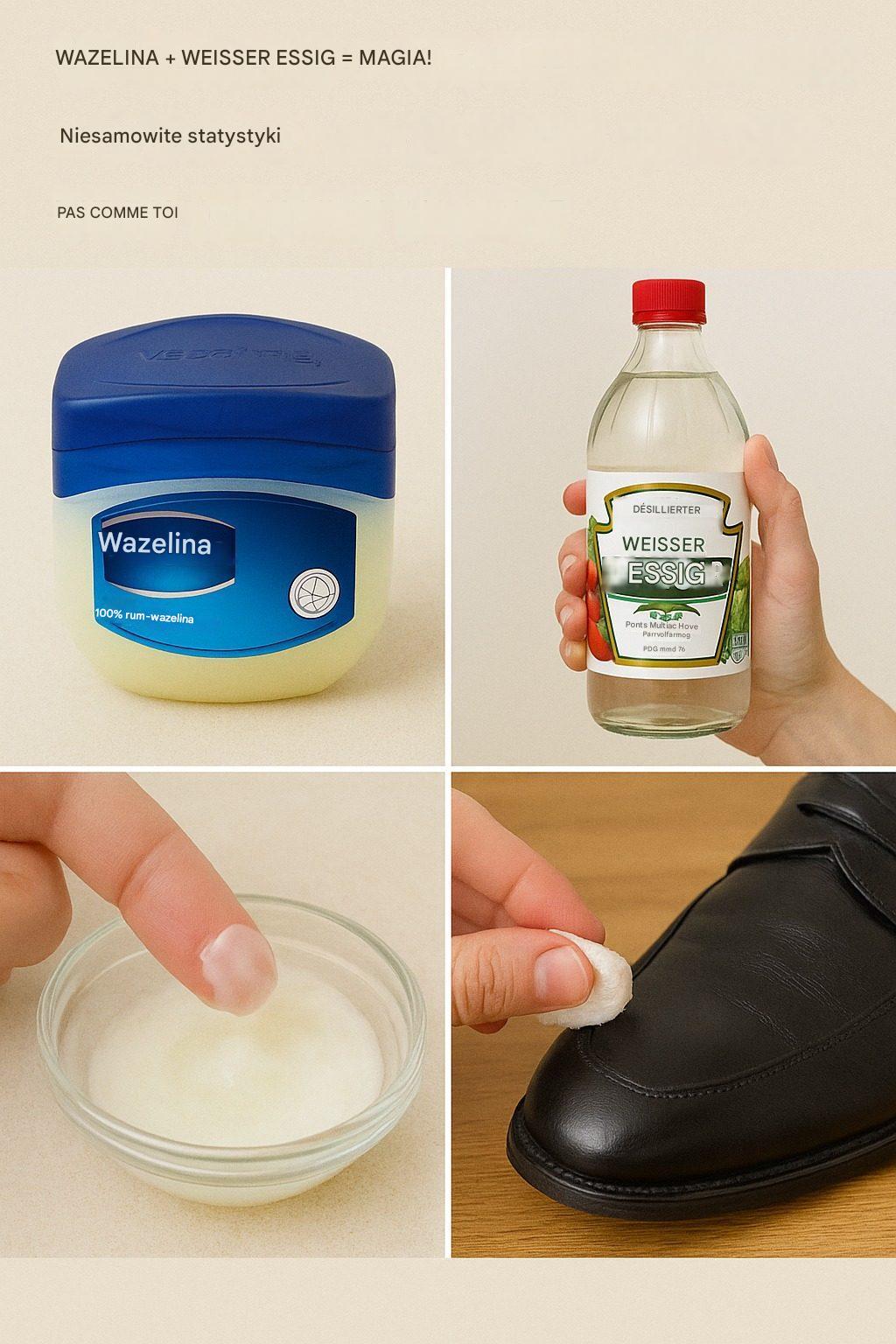 Czy Twoje skórzane wyroby, takie jak buty, torby czy meble, widziały lepsze czasy? Za pomocą prostej mieszanki wazeliny i białego octu możesz je przywrócić do życia. Oto jak: