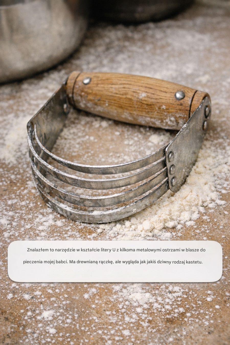 To narzędzie, zwane krajalnicą do ciasta, to klasyczne narzędzie służące do mieszania tłuszczu z mąką w celu formowania ciasta. Jego rola jest niezbędna w wypieku ciast, ponieważ pozwala uzyskać pożądaną, kruchą konsystencję ciasta kruchego i ciasteczek.