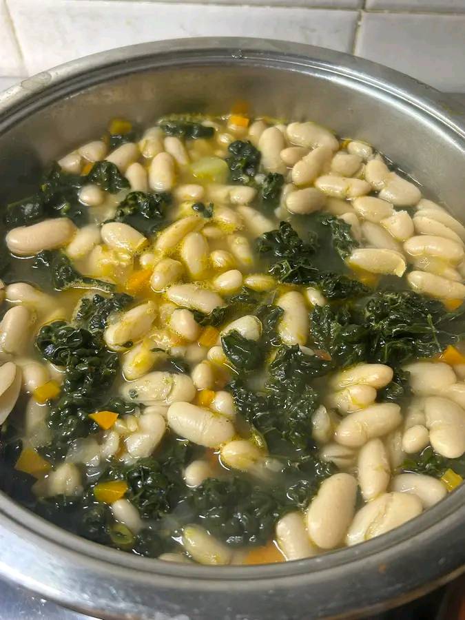 Dodaj odrobinę słodkiej papryki i koncentratu pomidorowego dla koloru, w razie potrzeby dostosuj ilość bulionu warzywnego, dodaj ugotowaną fasolę cannellini i gotuj przez kolejne 10–15 minut.
